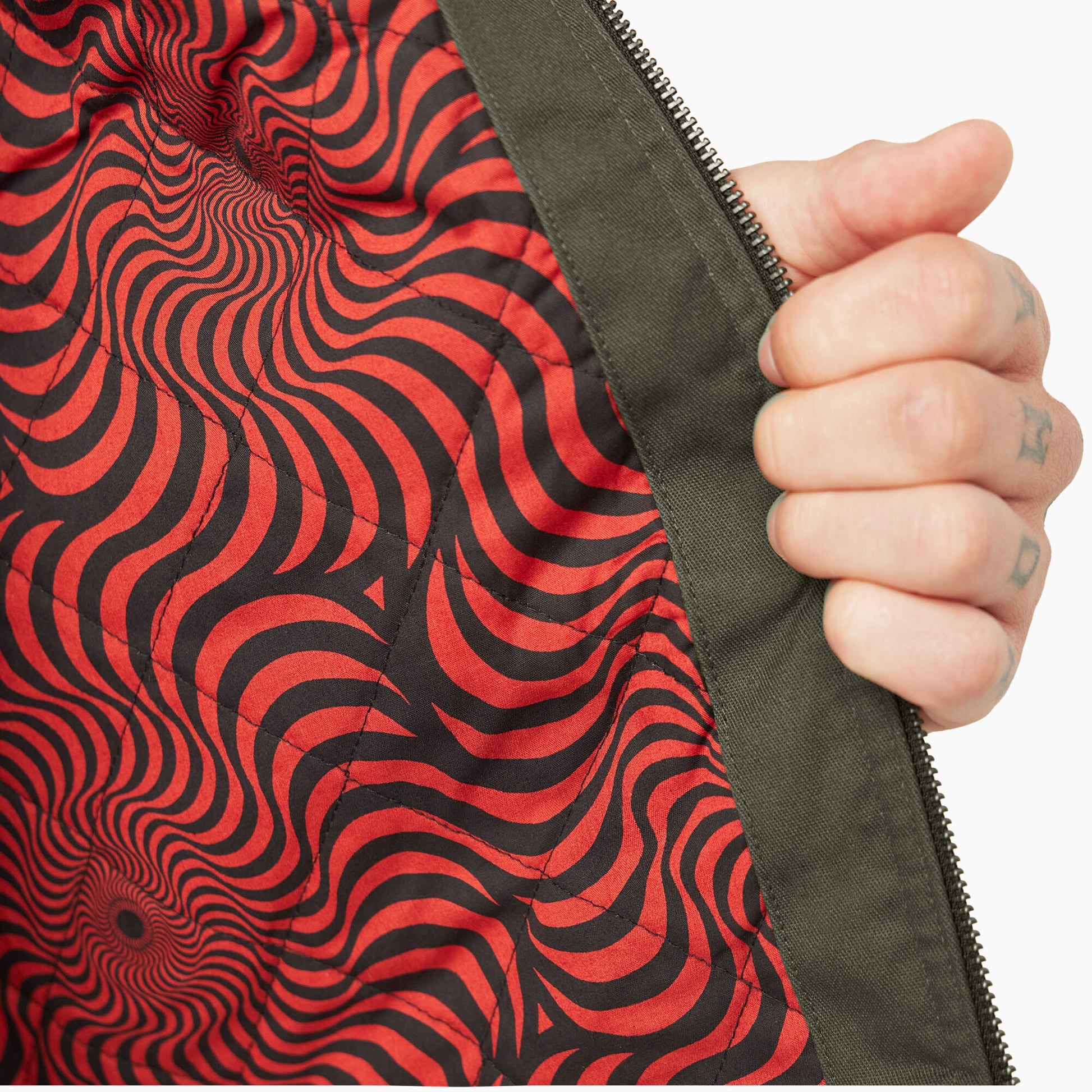 Dickies X Spitfire is dedicated to the skateboarding community. Inspired by our iconic Eisenhower jacket, this men’s style is crafted from our signature workwear fabric and features a quilted interior lining with Spitfire’s infinity crescent all-over print. It has a contrasting collar, Durable Water Repellent finish, and co-branded embroidery on the sleeve pocket.