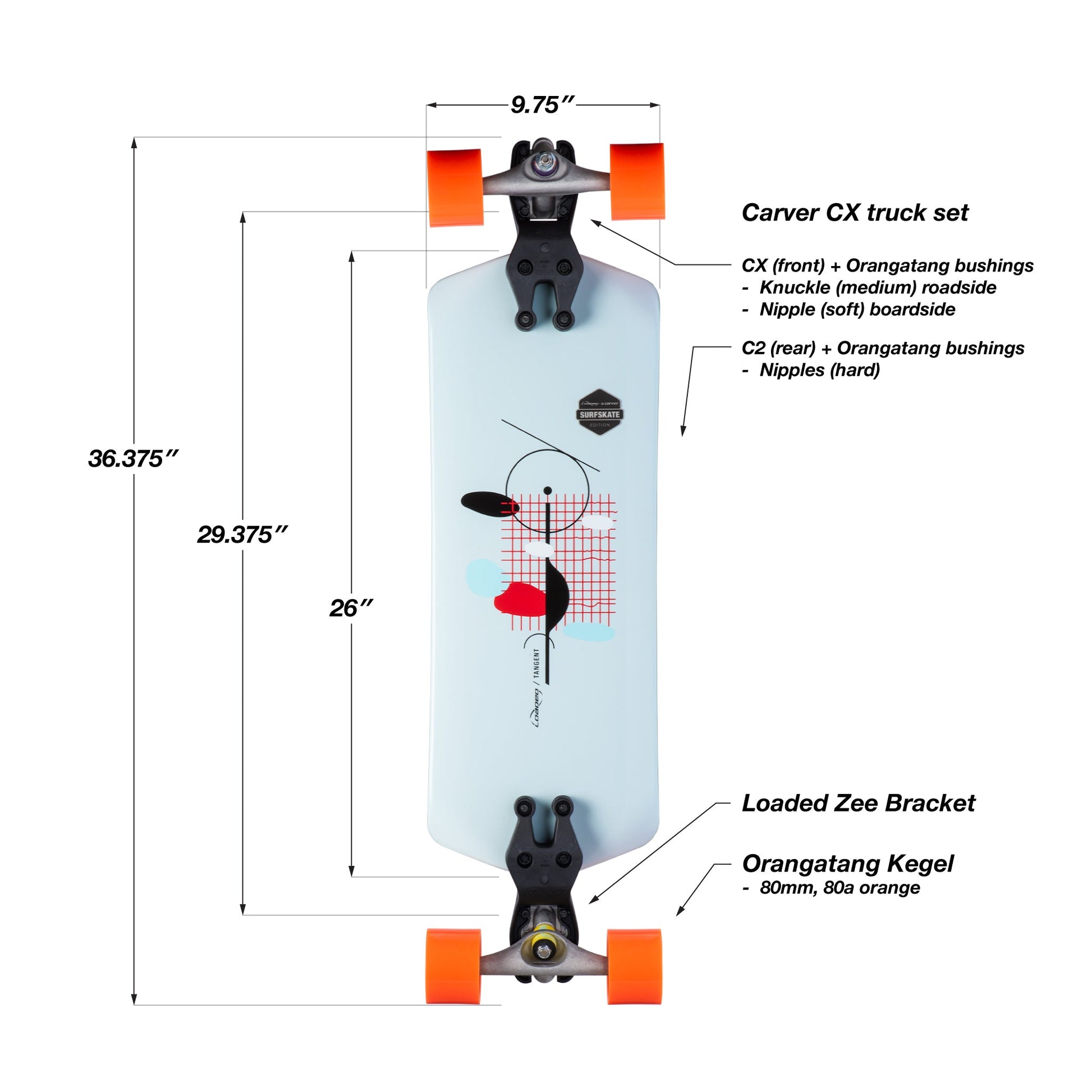 Both the Tangent and the Fathom surfskate series boards have been finely tuned with a custom unique truck configuration. Carver CX front and C2 rear plus 80a orange Kegels. The Carver trucks have been upgraded with a unique Orangatang bushing setup: purple Knuckles in front for energetic turns and yellow Nipples in the rear for drive and stability in the back.