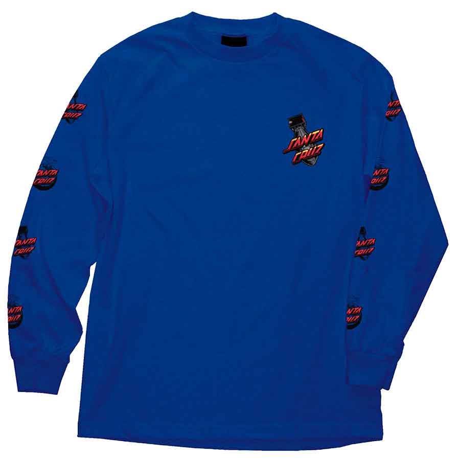 Classic graphics on new long sleeve t-shirt styles from Santa Cruz Skateboards. The Atomic Dot regular fit long sleeve 6 oz. jersey t-shirt features a small front, large back and repeating sleeve Atomic Dot logo prints in soft hand inks. Available in black and royal blue.